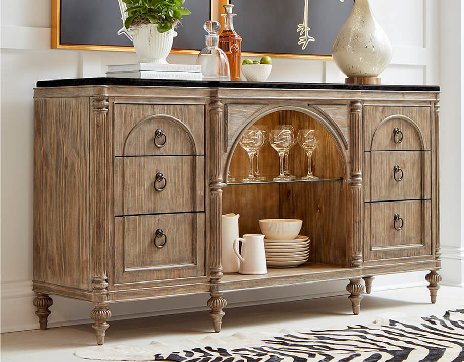 Step across the threshold of a new design frontier with the Architrave collection. Based on an architectural term that refers to a frame surrounding a doorway, this collection symbolizes a transition from history to the future. Architrave is historically inspired, reinventing the strong lines and classic symmetry of Neoclassical style from the Louis XVI period in France. This trendsetting 18th-century style is perfectly reimagined as a new casual classic,” dressed down in materials to evoke a more softened and livable feeling to suit modern taste. Pine solids and veneers are wire brushed and hand glazed in an almond tone with softened corners and worn details, finished with the delicate patina of oil rubbed bronze hardware.