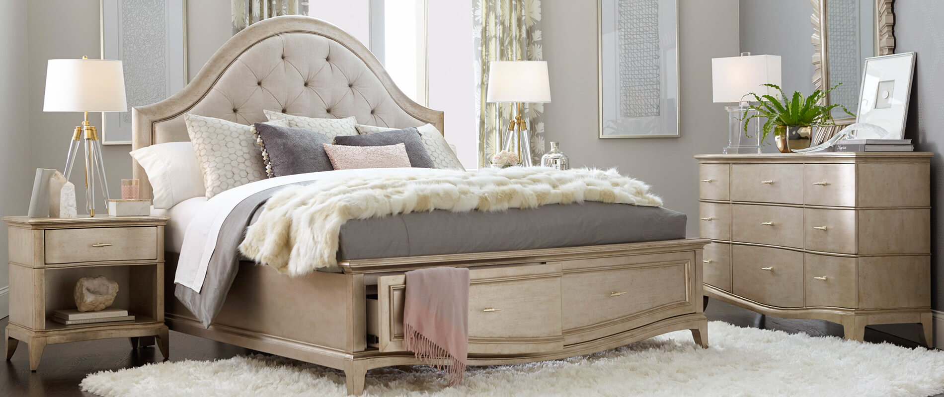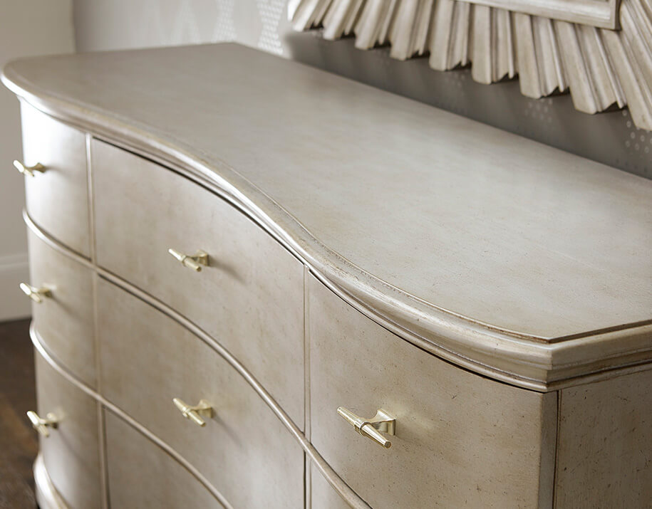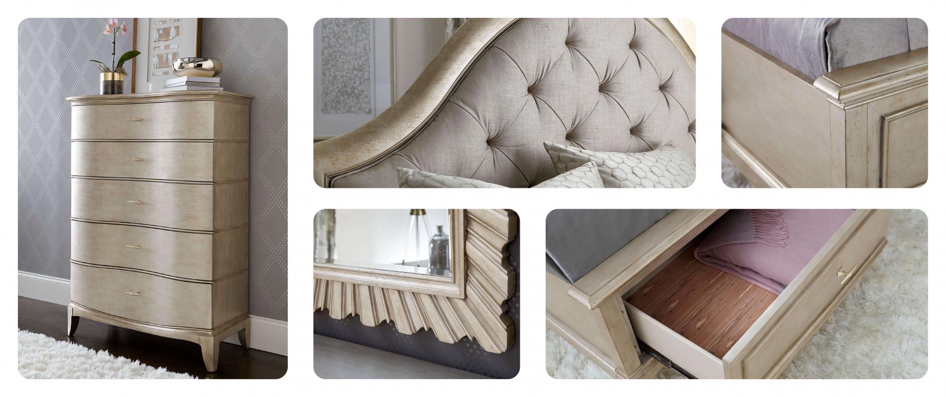 The European-inspired curvaceous pieces shimmer with a glazed silver finish that has been artfully aged and highlighted with touches of gold; grande luxe accents include everything from deep button tufting to sleek jewelry-inspired drawer pulls. Red carpet ready never looked better.