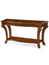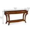 The edges of the Old World Sofa Table top are finished with a carved gadroon treatment that echoes the case pieces in the Old World Collection, and the table’s dramatically flared C-scrolled legs are carved and shaped to blend with the other tables in the collection. The legs have a practical purpose as well: the offset created by the inward curve of the legs keeps the lower shelf away from foot traffic and maintains the dominant presentation of the beautiful matched cherry veneer top.