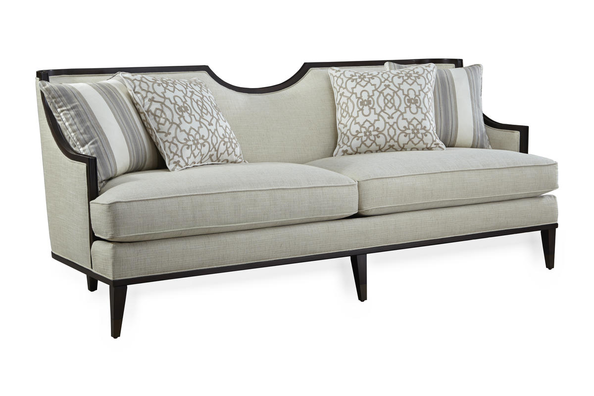 Clean and classic, the sleek Harper Sofa brings together elements of both contemporary and traditional design: square tapered wood legs, exposed wood frame, curved arms, and a reverse half moon cut out on the back. The sofa’s comfort, however, is 100 percent modern: tailored upholstered back and deck and two down-blend seat cushions, plus two pairs of down blend throw pillows. In addition to the sofa, the Harper Ivory collection includes a matching chair.