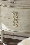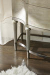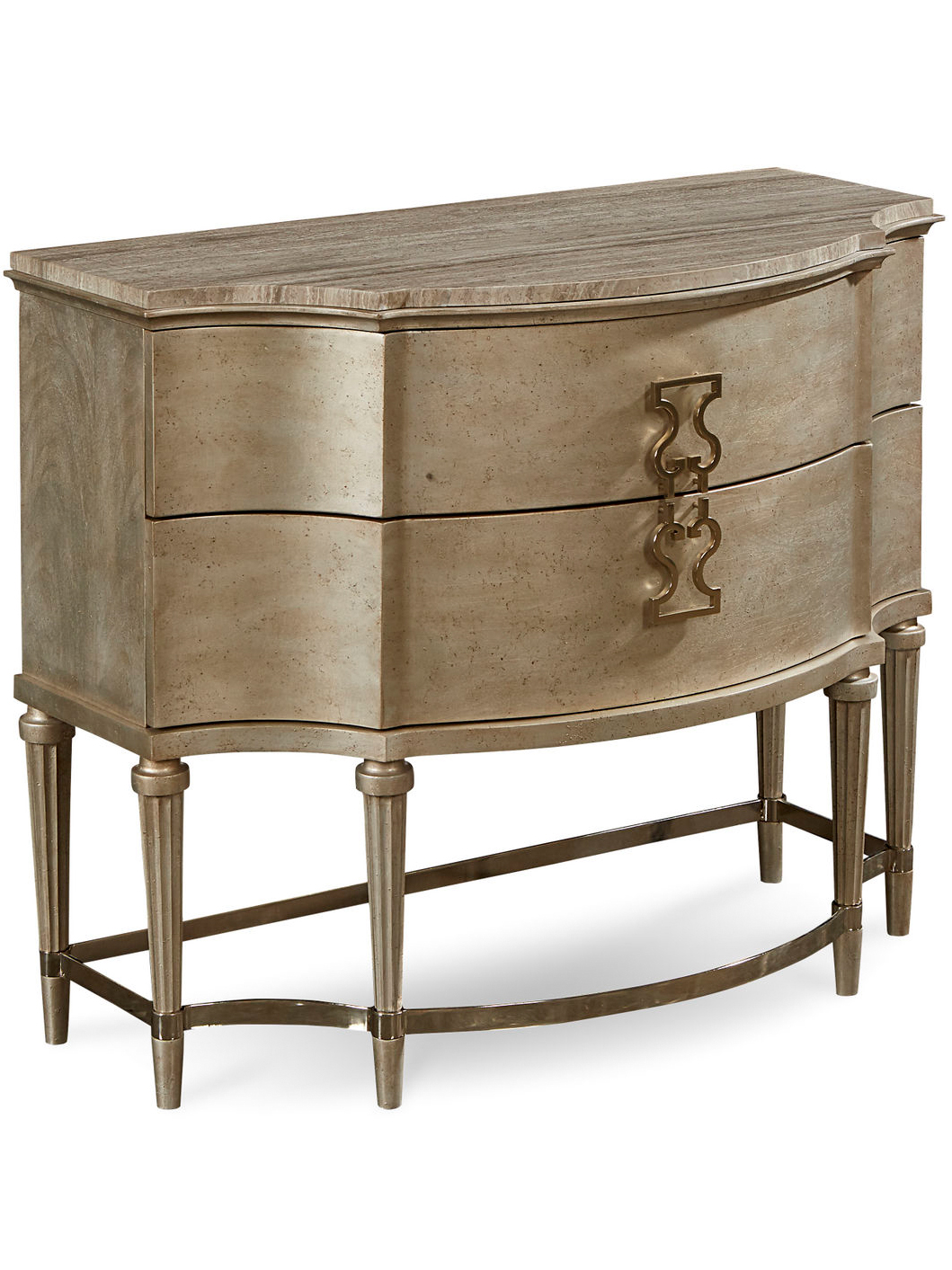 This chest’s graceful serpentine front, six fluted legs and polished stone top are classically traditional, but the glamorous Bezel silver finish and bright custom hardware and metal stretchers are straight out of the days of Art Deco high style.