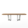 A dual pedestal, two-tone base evokes the strength and beauty of architectural columns in this substantial 90-in dining table. The elegant beauty of natural wood grain in a radiating pattern provides a striking contrast that juxtaposes organic and modern style. A 20-in leaf extends the table to 110-in, comfortably seating eight.