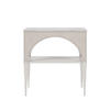 This petite night table combines the elegance and grace of the arches of Paris with the glamorous elements of antiqued mirror and a luxurious stone top. A light, open frame finished in dove gray makes this architecturally inspired bedside piece feel airy rather than solid, and a fixed lower shelf offers just enough space for books, baskets, or any other necessities.