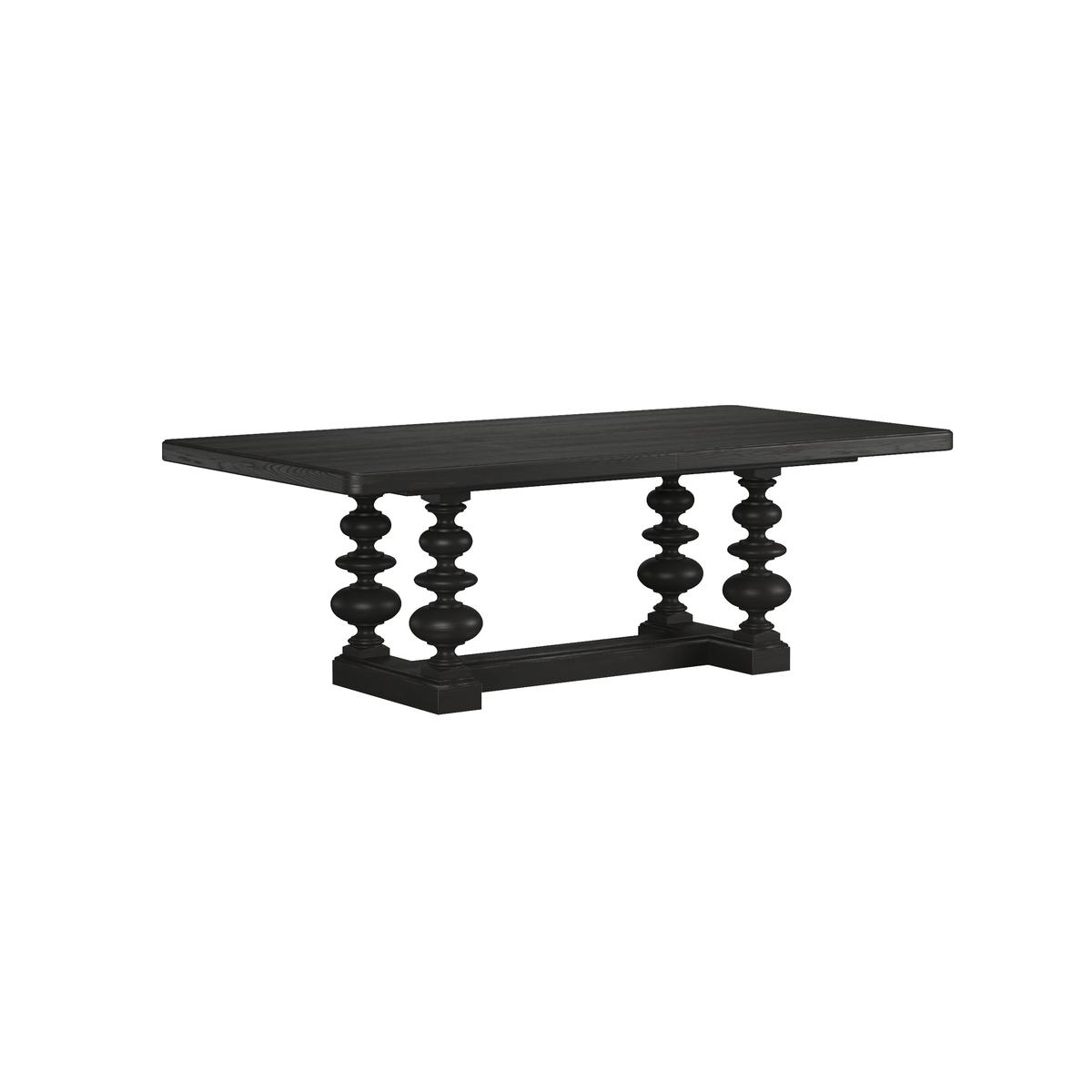 Sturdy enough to stand up to the challenge of daily family dinners, yet stylish enough to turn heads, the Atrium Trestle Table beautifully combines both form and function. The four robust columns are beautifully embellished in a cascade of orb-like turnings , the element of dystinction for the Atrium collection, while the solid trestle base evokes the feeling of grand historical architecture. The 88-in table can be extended to 108-in with the addition of one leaf.