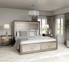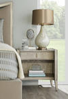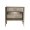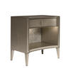 Crafted with a blend of Primavera veneers, cork, and metal, its durable construction ensures lasting beauty. Featuring a concave drawer face design and Mica finish, paired with pewter finished metal hardware, it exudes sophistication. With a touch dimmer light illuminating the cork paper application on the open shelf area and two USB chargers discreetly placed, this nightstand seamlessly integrates modern convenience with timeless elegance.