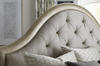 The generously button tufted upholstery of the Starlite King Upholstered Panel Bed with Storage is framed in an arch of gently curved molding and has two roomy storage drawers in the footboard. The bed is finished in silver Bezel paint that has been glazed and gently aged for a soft sheen, and is also available in Queen and California King sizes.